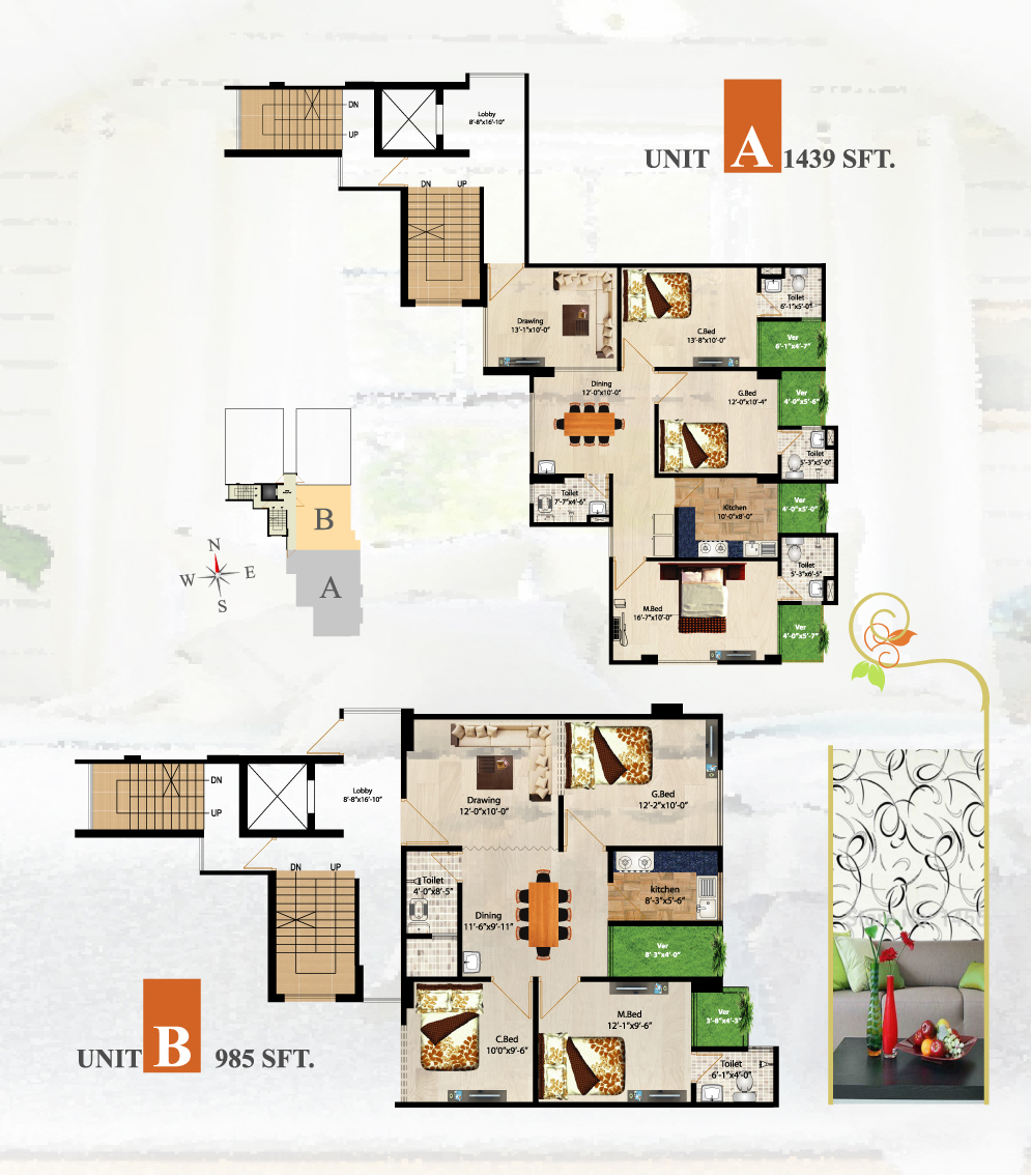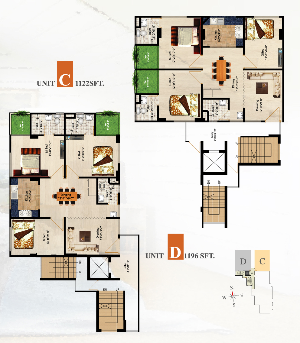 Size of Apartment: A-1350, B-1050, C-1300 sft